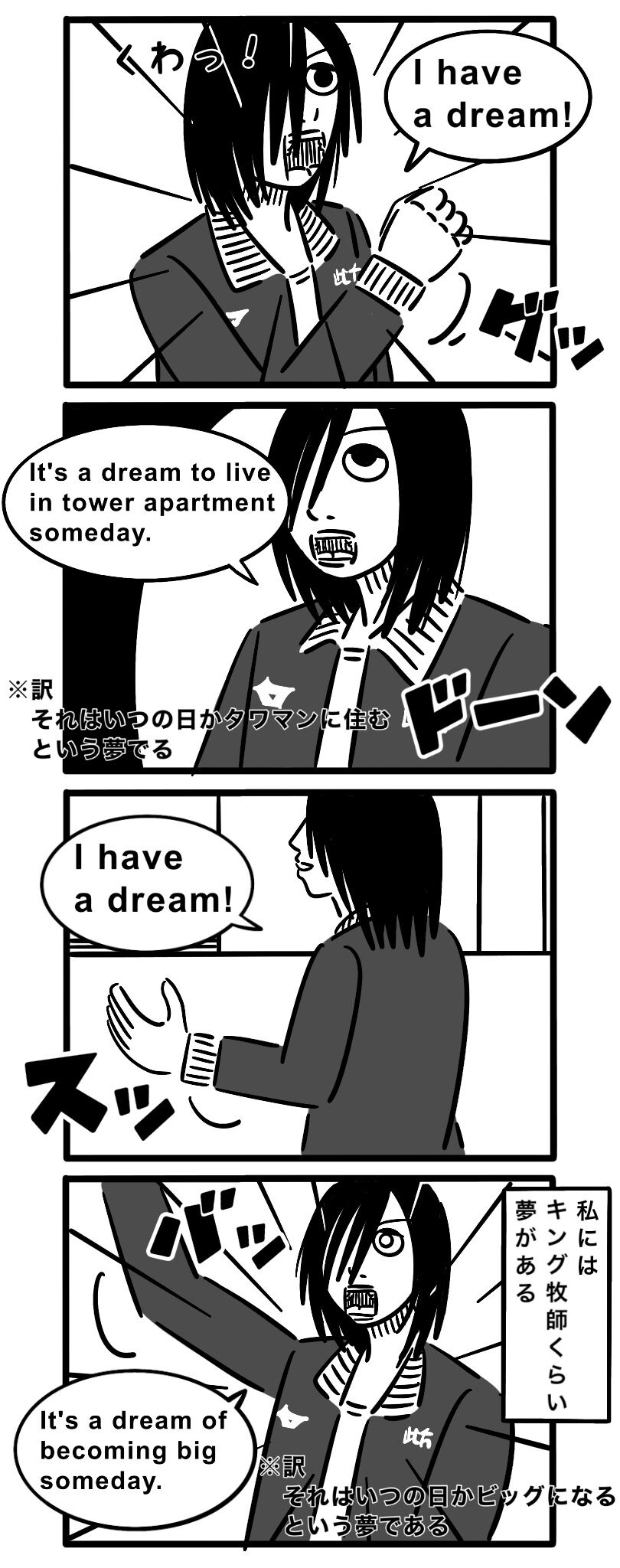 【私には夢がある!】家で一人キング牧師になりきる男 2022年05月24日 21:00 好きなんですよね、キング牧師のスピーチ彼の夢に比べたら僕の夢なんて超個人的なことばかりで終わってますがでも夢であることに変わりはないそしておんなじくらいたくさん夢ああるそれをキング牧師と同じ熱量でスピーチしてる家で一人聴衆もいない中笑いつか全編英語でフルバージョンでどこかで披露したいわそんな夢もある私はUVERworldを聴く熱い男↓ Twitterもフォローしてね↓ 絵本発売されてますのでぜひチェックしてください!↓ カテゴリなしの他の記事 タグ :#日常漫画#4コマ漫画#絵日記ブログ#イラスト日記#エッセイ漫画#キング牧師#スピーチ#私には夢がある#タワマン#ビッグ < 前の記事次の記事 > コメント コメントフォーム 名前 コメント 記事の評価 リセット リセット 顔 星 情報を記憶 コメントを投稿する