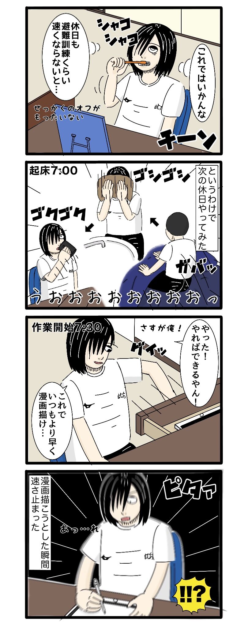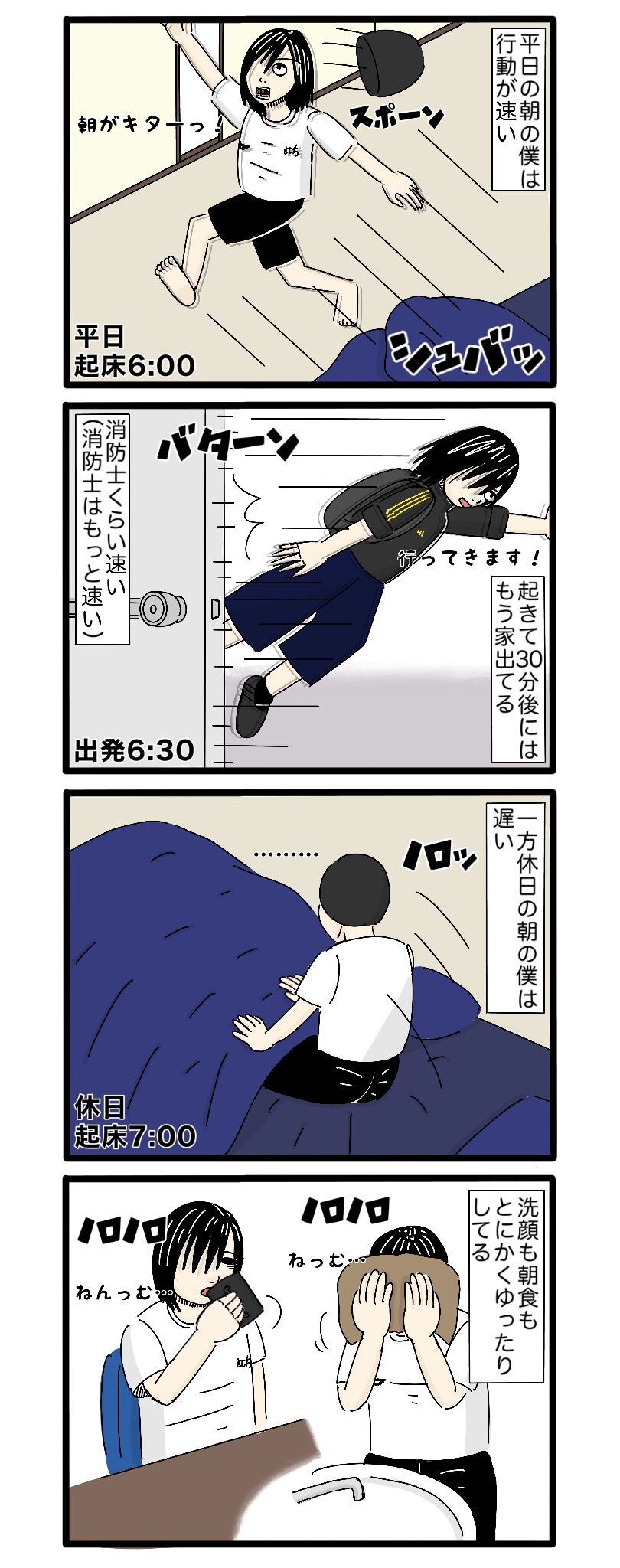 【朝】平日の朝と休日の朝の違い 2025年11月04日 21:00 勢いつけて漫画描き始めたはずなのに…朝はおしゃれだけど昼は…?↓キンドルでコロナ禍(2020〜2022)の無料まとめ本出しましたのでそちらもぜひ↓ 「生活」カテゴリの最新記事 タグ :#平日#朝#行動#消防士#休日#洗顔#朝食#避難訓練#速さ < 前の記事次の記事 > コメント コメントフォーム 名前 コメント 記事の評価 リセット リセット 顔 星 情報を記憶 コメントを投稿する