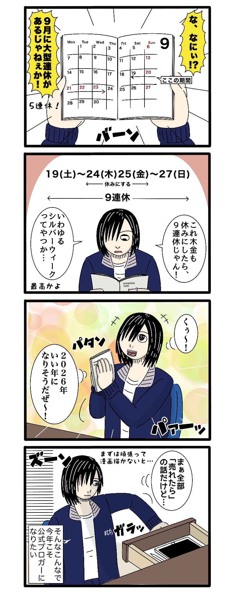 【手帳】2026年の予定やら目標やら 2026年01月12日 21:00 僕はW杯だけサッカー観る絵に描いたようなにわか笑シルバーウィークも楽しみいっぱい漫画読んでくださると嬉しいです手帳とカレンダー↓ キンドルでコロナ禍(2020〜2022)の無料まとめ本出しましたのでそちらもぜひ↓ 「生活」カテゴリの最新記事 タグ :#2026年#手帳#予定#W杯#サッカー#シルバーウィーク#大型連休#9月#公式ブロガー < 前の記事次の記事 > コメント コメントフォーム 名前 コメント 記事の評価 リセット リセット 顔 星 情報を記憶 コメントを投稿する