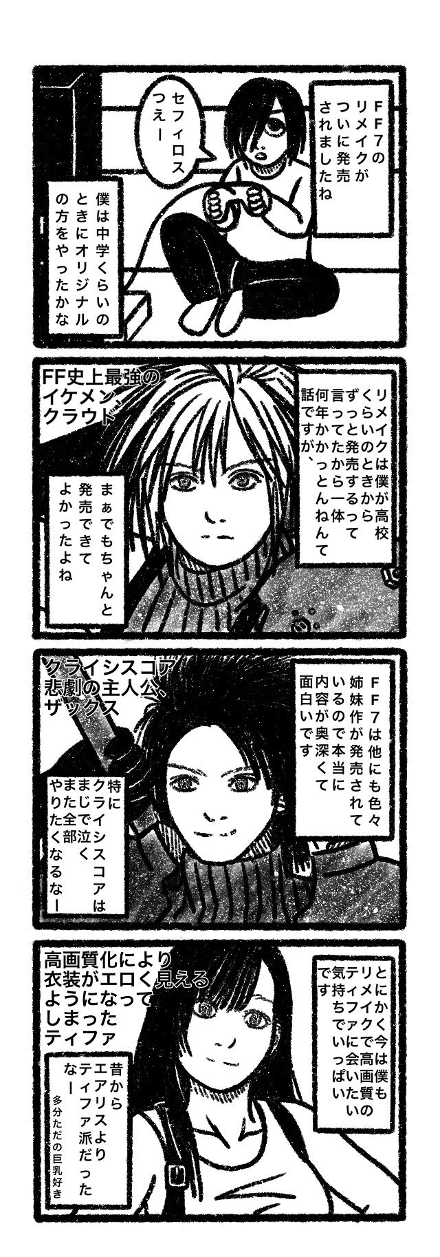 【ファイナルファンタジー7】FF7のリメイクが何年か越しに発売された! 2020年04月23日 21:00 リメイク死ぬほどやりたい7は本当に素晴らしい作品僕はアドベントチルドレンも見たしダージュオブケルベロスもクライシスコアもやったやってないのビフォアクライシスくらいリメイクもやらなきゃという使命感ある7はキャラもいいクラウドは言わずもがな、ヴィンセントもイケメンだしティファとユフィも可愛い高画質化してさらに良くなってるだろうな〜家にゲームもテレビもないのがほんまに辛い… カテゴリなしの他の記事 タグ :#エッセイ#日常#4コマ#マンガ#絵日記#FF7#ファイナルファンタジー7#クラウド#ティファ < 前の記事次の記事 > コメント コメントフォーム 名前 コメント 記事の評価 リセット リセット 顔 星 情報を記憶 コメントを投稿する