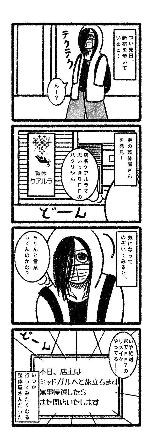 【ファイナルファンタジー7】新宿で見つけた謎の整体屋さん、ケアルラ 2020年04月28日 21:00 俺はニブルヘイムに行きたいよ カテゴリなしの他の記事 タグ :#エッセイ#日常#4コマ#マンガ#絵日記#ファイナルファンタジー7#FF7 < 前の記事次の記事 > コメント コメントフォーム 名前 コメント 記事の評価 リセット リセット 顔 星 情報を記憶 コメントを投稿する