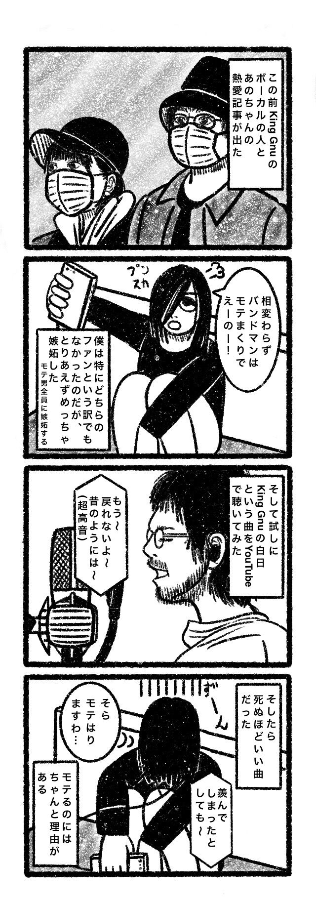 【King Gnu】とにかくバンドマン(特にボーカルの方)はモテまくるという真理 2020年04月30日 21:00 井口さん、あの見た目であの高音はギャップやばいわ…King Gnuって名前はなんとなく聞いたことあったけど 曲は知らなかったんですよね最近白日めっちゃ聴いてる「うんざりするよ」のとこ好きホントに、うんざりする笑絵日記ランキングにほんブログ村 カテゴリなしの他の記事 タグ :#エッセイ#日常#4コマ#マンガ#絵日記#KingGnu#井口理#あの#あのちゃん#白日 < 前の記事次の記事 > コメント コメントフォーム 名前 コメント 記事の評価 リセット リセット 顔 星 情報を記憶 コメントを投稿する